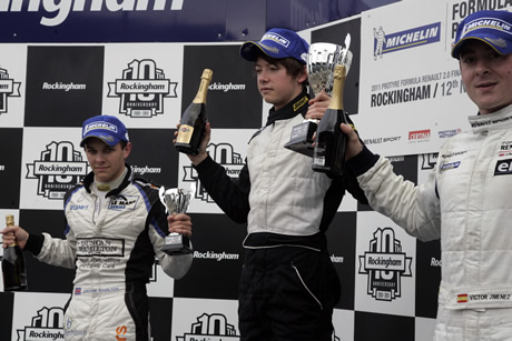 MGR Motorsport's Matt Mason (1st) and James Fletcher (3rd) celebrate on the podium after race one.